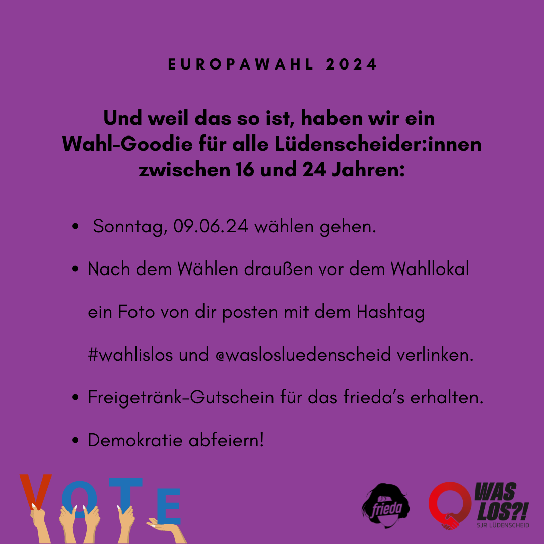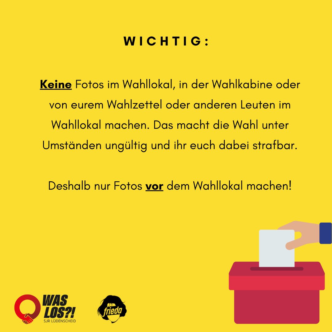 - Nach dem Wählen draußen vor dem Wahllokal ein Foto von dir posten mit dem Hashtag #wahlislos und @waslosluedenscheid verlinken.