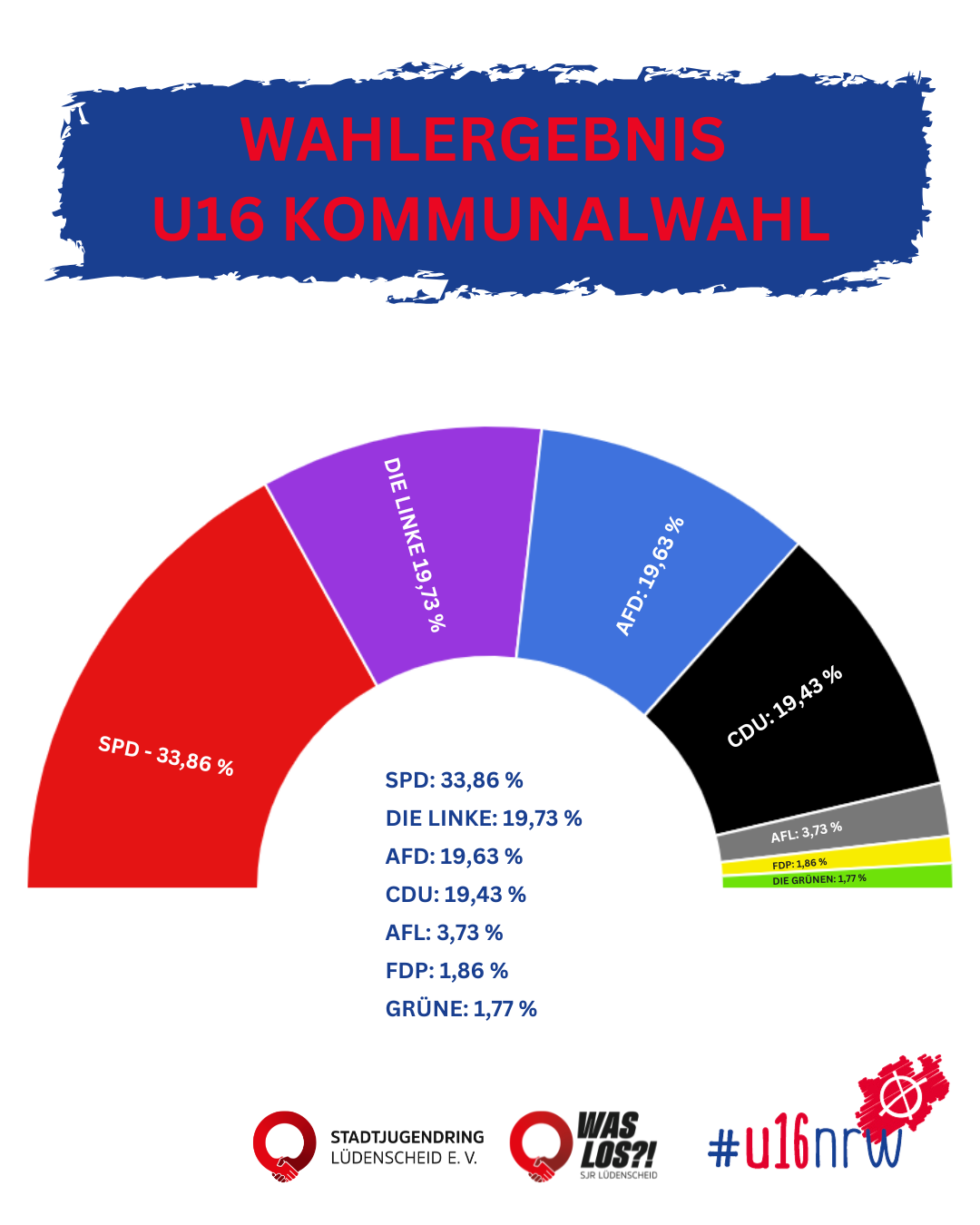 Die hohe Beteiligung der unter 16-Jährigen an der Wahlsimulation zeigt deutlich, wie wichtig eine Einbindung junger Menschen in politische Prozesse ist. Wir bedanken uns herzlich bei den Schulen, in denen wir die Wahlen durchführen durften und ganz besonders bei den verantwortlichen Lehrkräften und Schüler:innen, die uns vor Ort unterstützt und die Wahlen mit ihren Klassen inhaltlich vorbereitet haben. Ein weiterer Dank geht an die Jugendtreffs, die im Rahmen ihrer offenen Tür mit Jugendlichen über die Wahlen ins Gespräch kamen und ihnen eine Wahlmöglichkeit gegeben haben. Wir bedanken uns bei vielen ehrenamtlichen Helfer*innen, die die U16-Wahl in Lüdenscheid möglich gemacht haben.