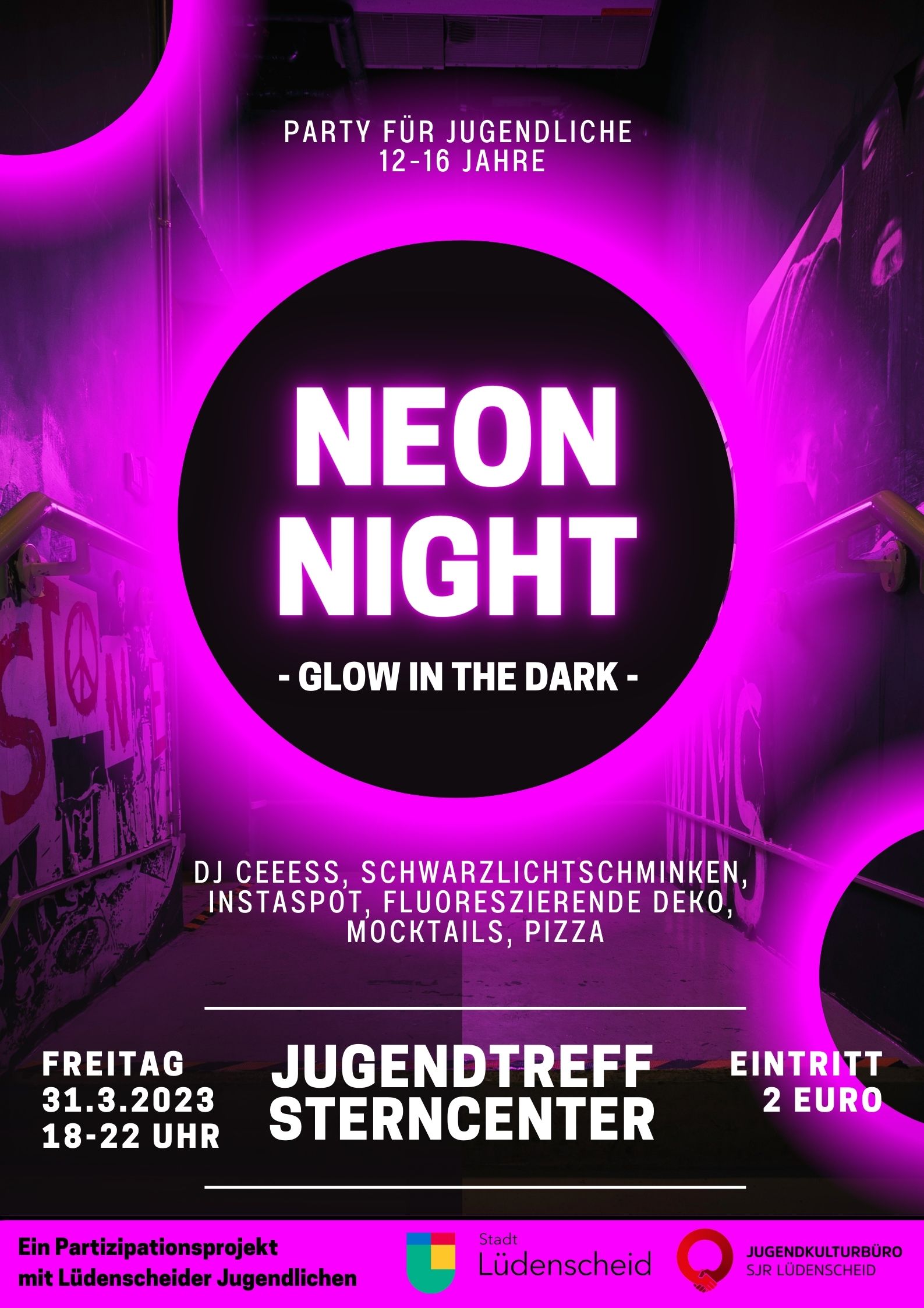 Bereits zum zweiten Mal hat sich eine Gruppe von etwa zehn Jugendlichen, darunter viele neue Gesichter, ein tolles Partymotto für euch überlegt und organisiert! Es dreht sich alles um das Motto Neon und Schwarzlicht: Wir haben fluoreszierende Deko und Accessoires, bieten Schminkstationen (Tattoos, Haare, Makeup und Nägel) an, es gibt einen coolen Instaspot und leckere Mocktails und Pizza. DJ Ceeeß legt für euch auf. Der Eintritt kostet 2 €. Let's glow in the dark!