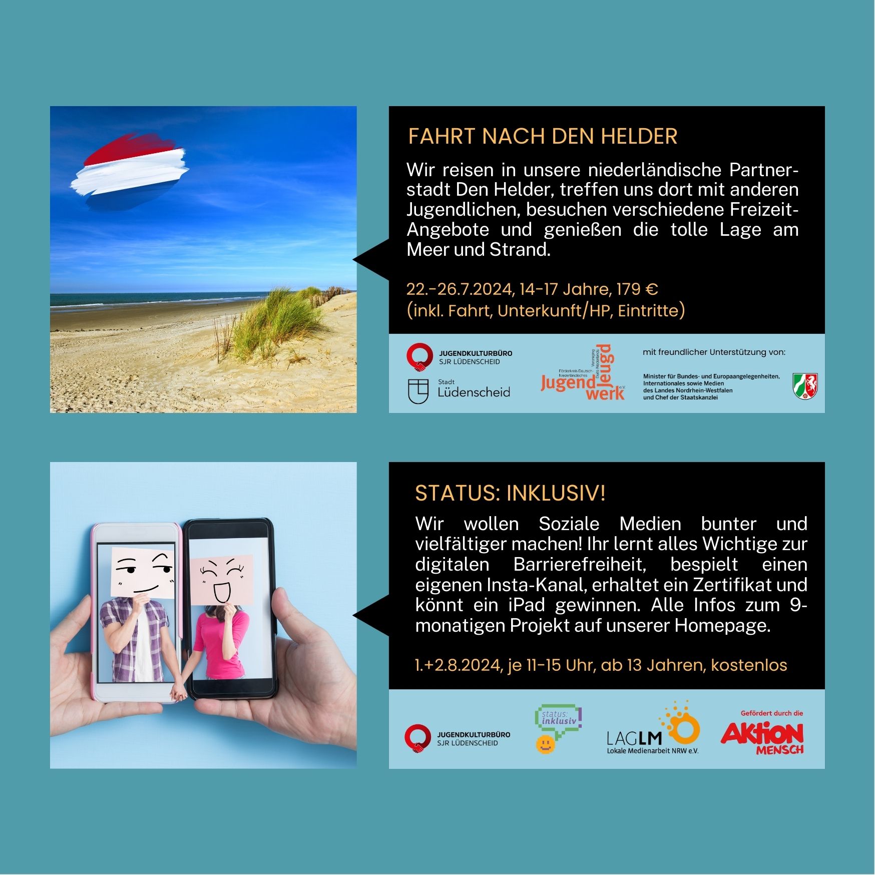 Detaillierte Infos zu unseren Angeboten findest du weiter unten, sowie auch das Anmeldeformular für unsere Angebote. Falls trotzdem Fragen offen sind, melde dich gern bei Julia Wilksen/Jugendkulturbüro unter 02351 673163 oder 0151 20233885.